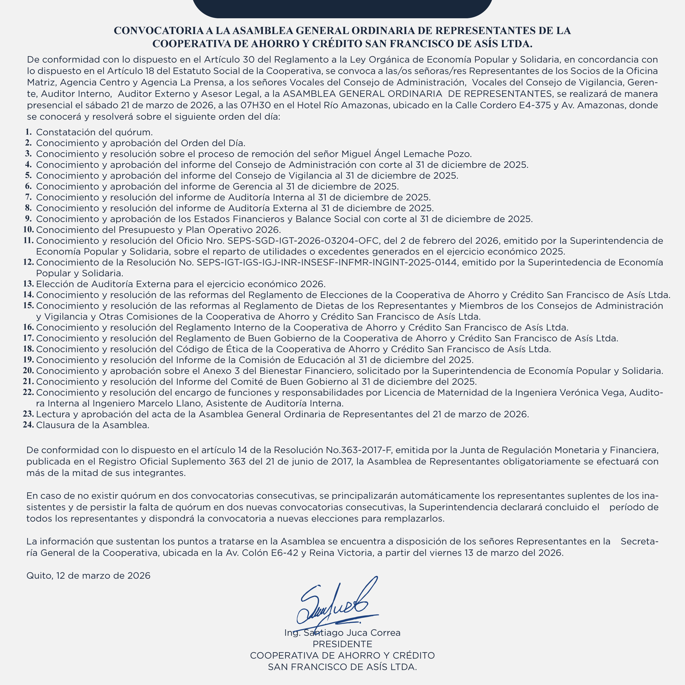Desde el 22 de agosto de 2025, Cuenca ya cuenta con una agencia de la Cooperativa de Ahorro y Crédito San Francisco de Asís, que marca un hito en su crecimiento, al expandirse fuera de la provincia de Pichincha.